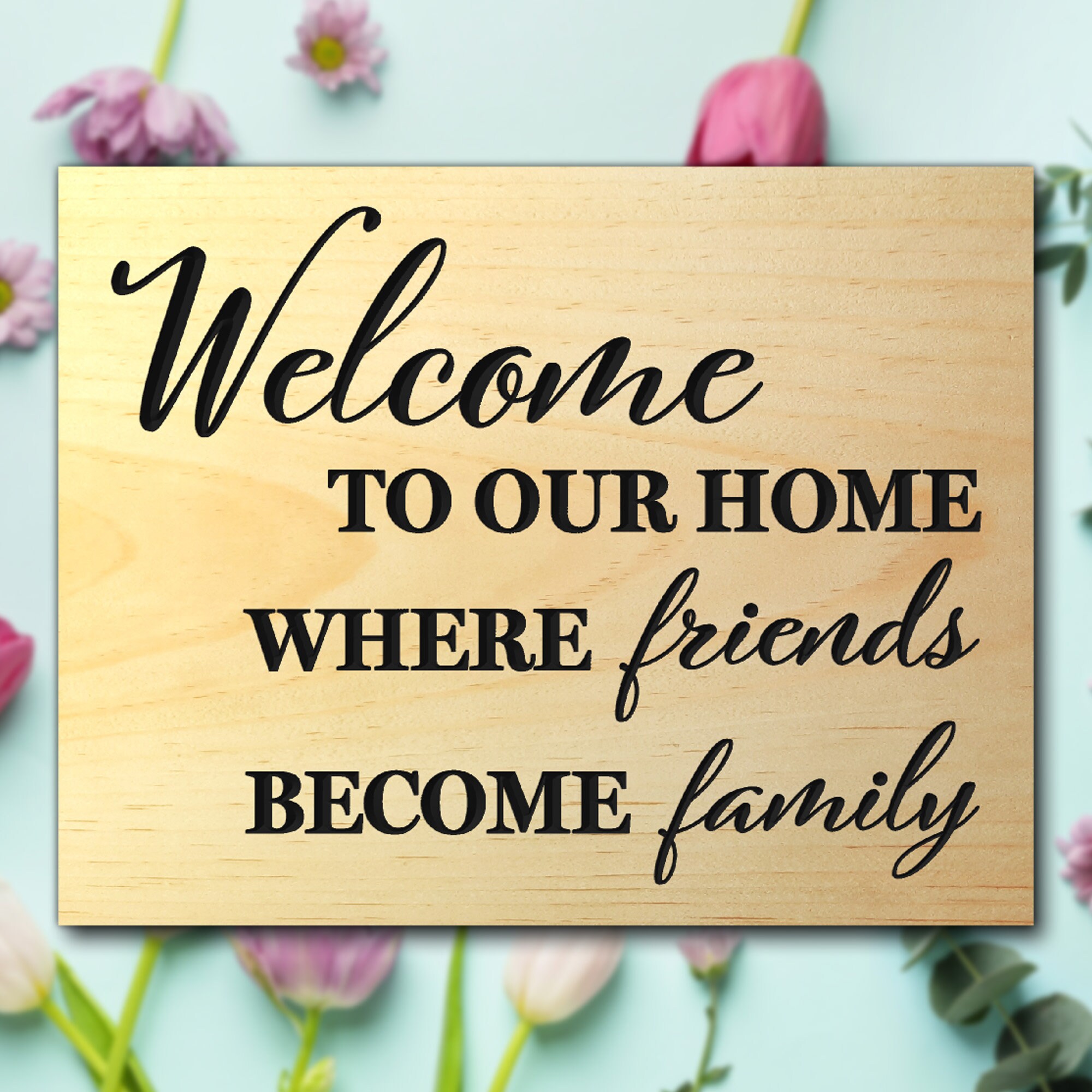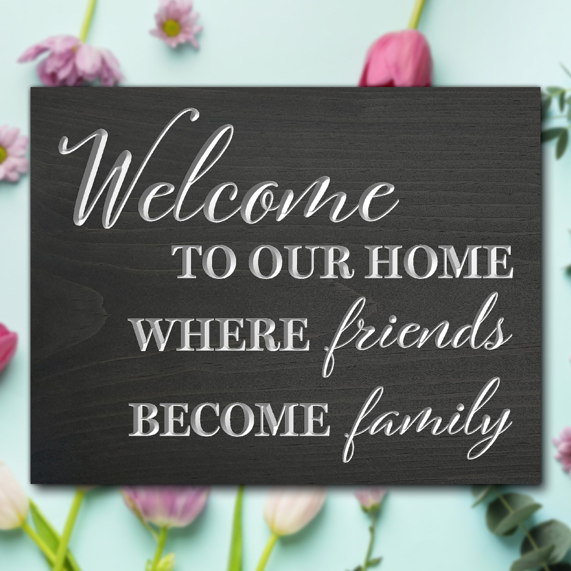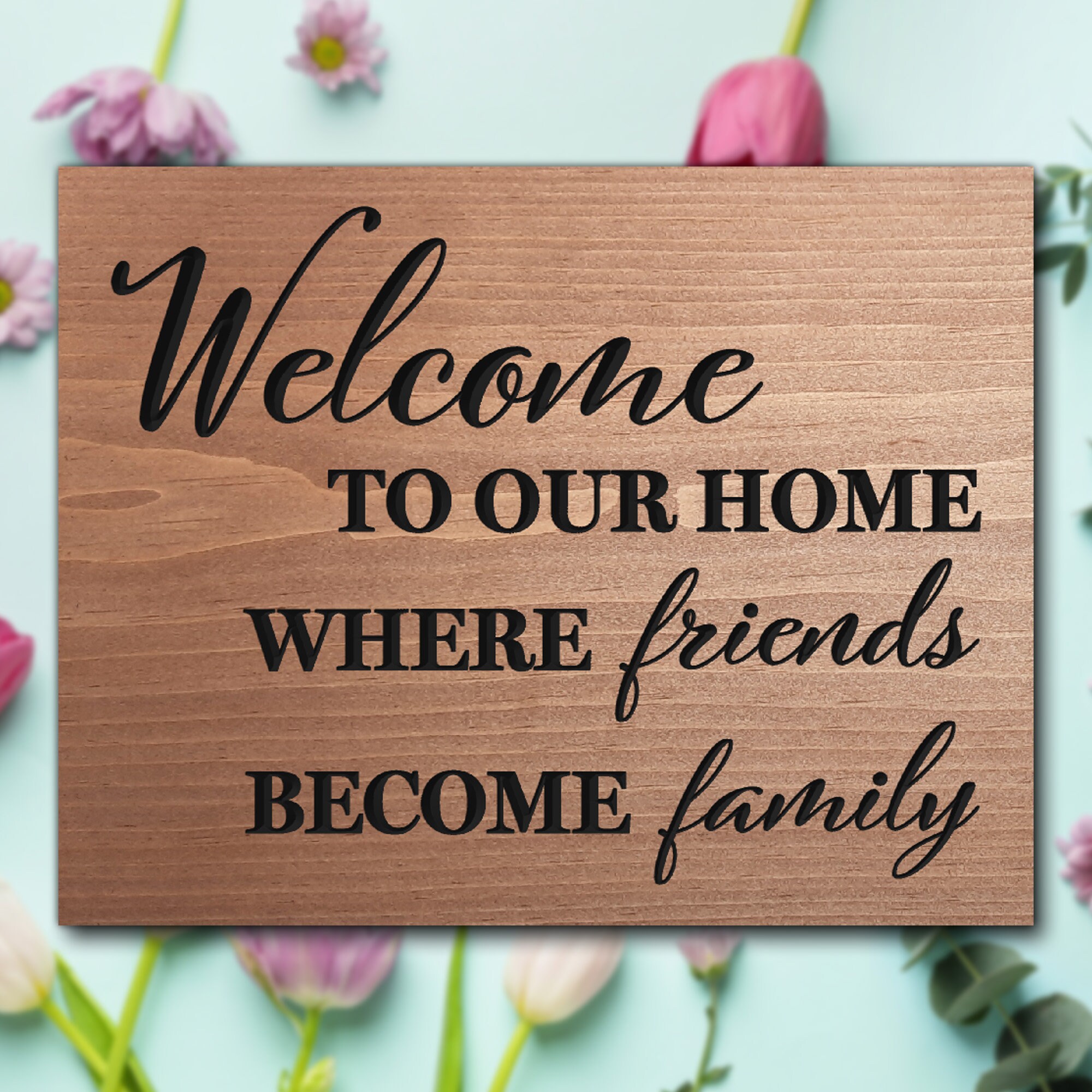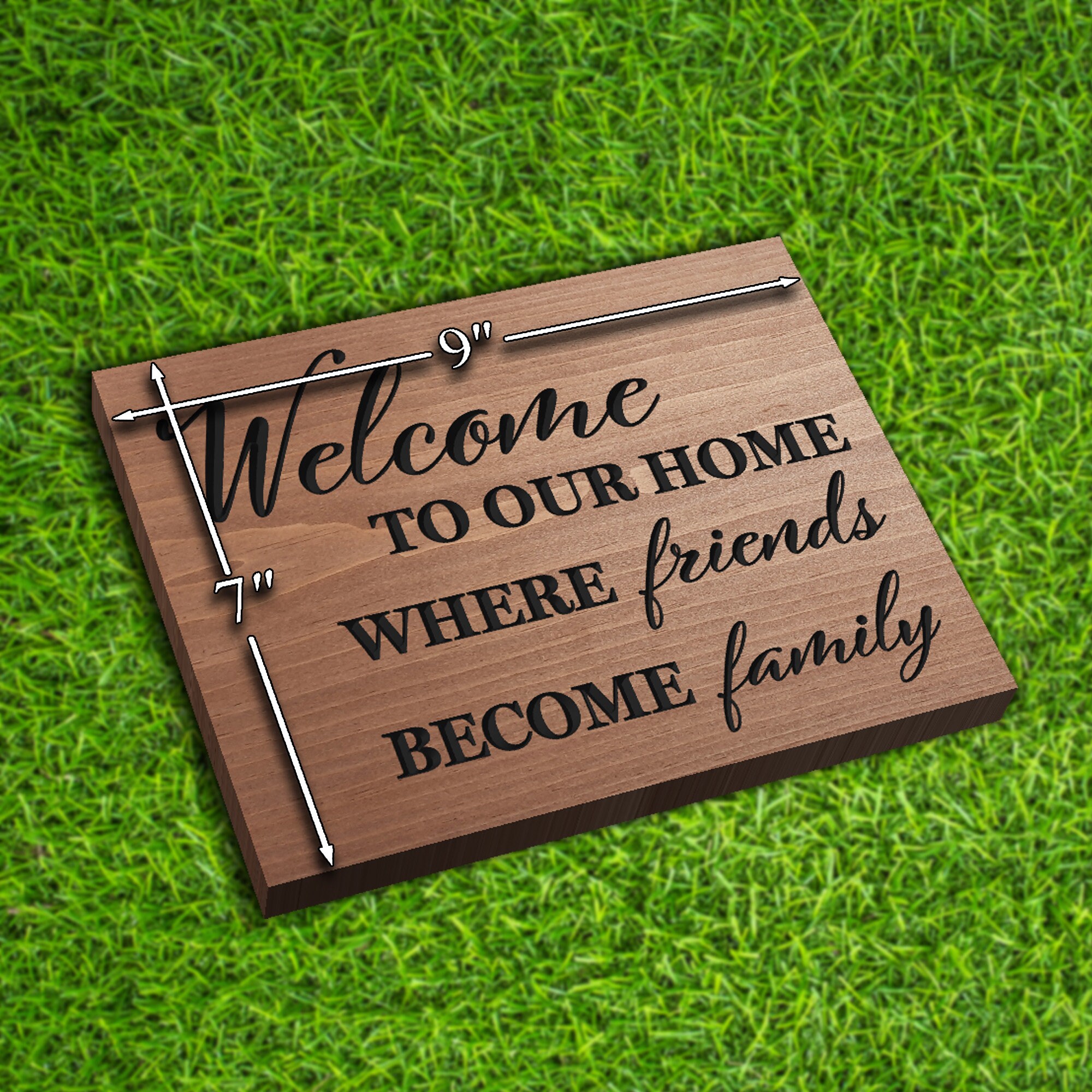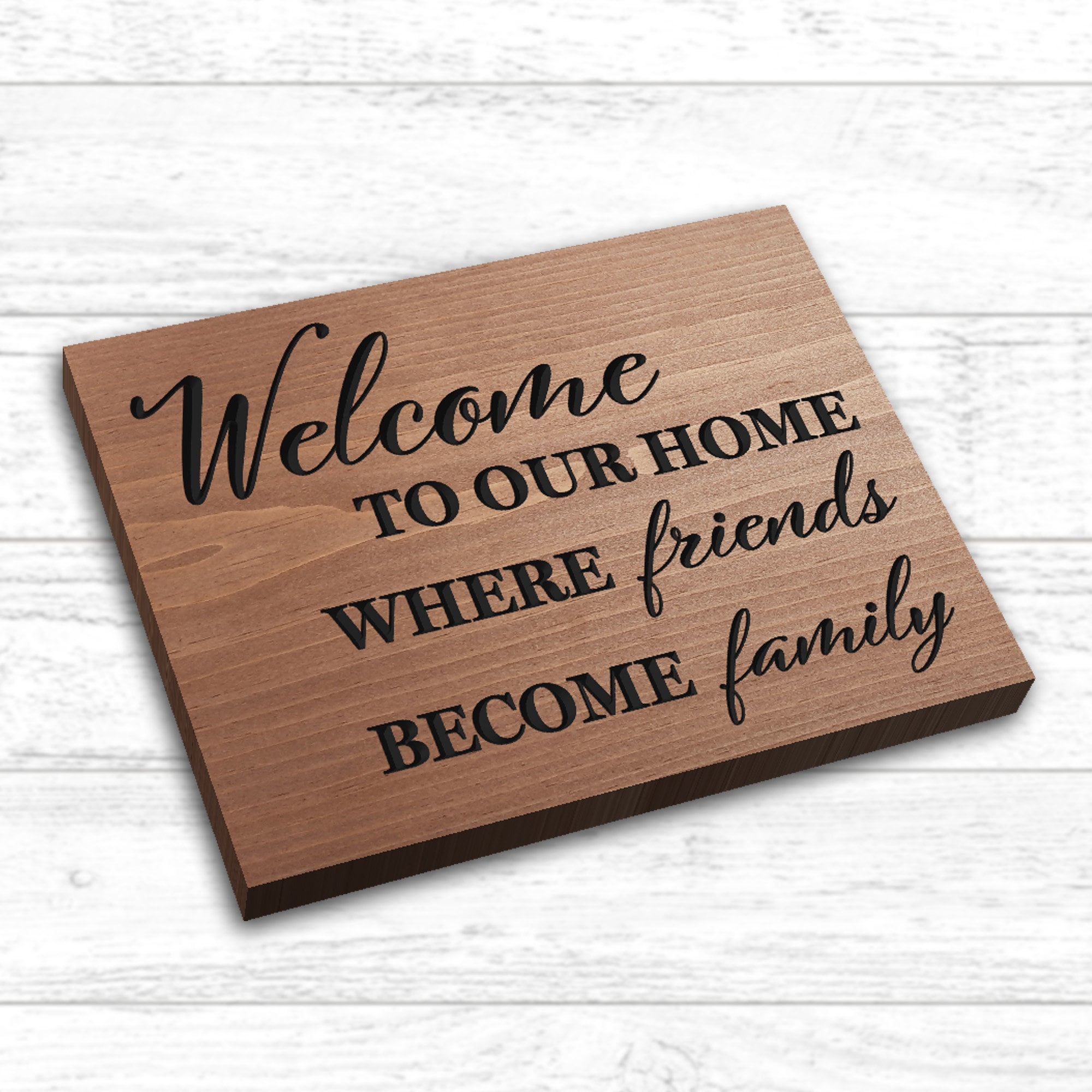 Wooden Welcome Sign. Solid pine with your choice of stain. Engraved text with contrasting paint. Polyurethane finish to provide years of indoor protection. Handmade in the USA.